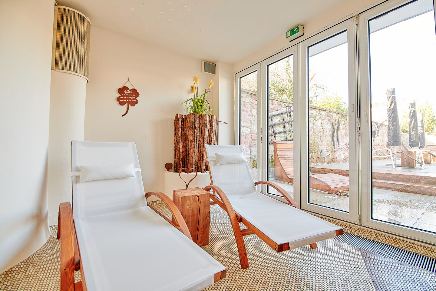 Entspannen Sie sich im Ruheraum oder genießen das schöne Pfälzer Wetter im Außenbereich.